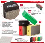 Proline spužve za brušenje za zaglađivanje i poliranje površina i rezanih rubova, između ostalog keramičke pločice, prirodni kamen i keramika. Savršeno za rad na pristupačnim mjestima i za zaglađivanje rubova nakon rezanja. Spužve omogućuju suhi rad, iako se preporuča mokri rad za produljenje vijeka trajanja proizvoda. Rad na glačanju ili poliranju treba podijeliti u etape, počevši od najmanje veličine zrna 50 pa do 400. Male, kompaktne dimenzije, fleksibilna struktura EVA pjene i bočni rezovi osiguravaju udobnost i tijekom dugotrajnog rada.