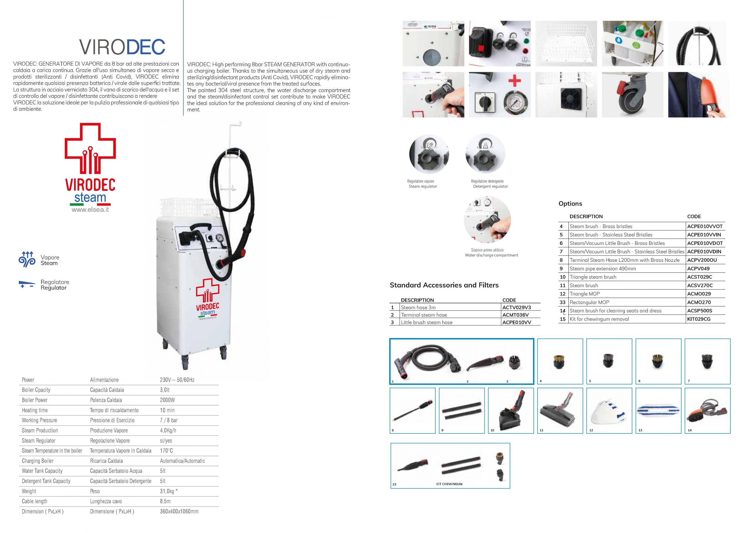 Virodec: generator pare visokih performansi od 8 bara s kotlom za kontinuirano punjenje. Zahvaljujući istodobnoj upotrebi suhe pare i sterilnih / dezinficijensnih proizvoda (Anti Covid), Virodec brzo uklanja sve prisutnosti bakterija / virusa s tretiranih površina. Obojena čelična konstrukcija 304, pretinac za ispuštanje vode i idealno rješenje za profesionalno čišćenje bilo koje vrste okoliša.