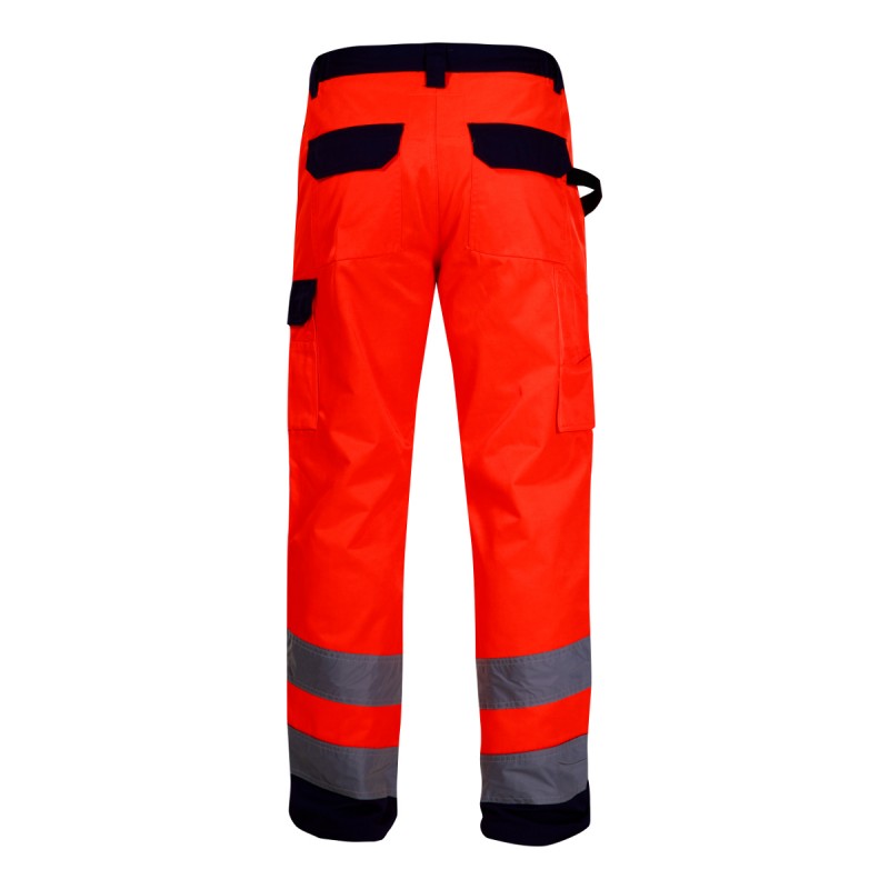 - Reflektirajuće trake prema EN ISO 20471. Stupanj visoke vidljivosti: stupanj 2. Dvostruki šavovi. Prilagodba struka vezicom. Pojasne petlje. Snap zatvarač presvučen plastikom za zaštitu od vode. 10 džepova, uključujući 4 s čičak trakama. Džepovi za koljena s kopčama na čičak. Petlja čekića.