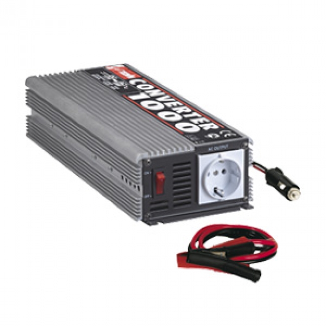12 VDC – 230 VAC inverter idealan za napajanje autom ili kamperom, za LCD ili plazmu TV, halogene zidne svjetiljke, čekić bušilice, strojevi za poliranje, električne alate općenito, kao i za punjenje baterija laptopa, PDA, digitalnih kamera, mobilnih telefona i sl. Kada je spojen na utičnicu auto-upaljača, pretvara 12V napon baterije u 230V. Zaštićena od zamjene polariteta i preopterećenja. Maksimalna izlazna snaga 1000W, masa 2,8kg