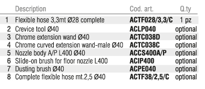 Uređaji se tvornički se isporučuje s crijevom i filterom. Nastavci se naručuju posebno po vlastitom izboru.